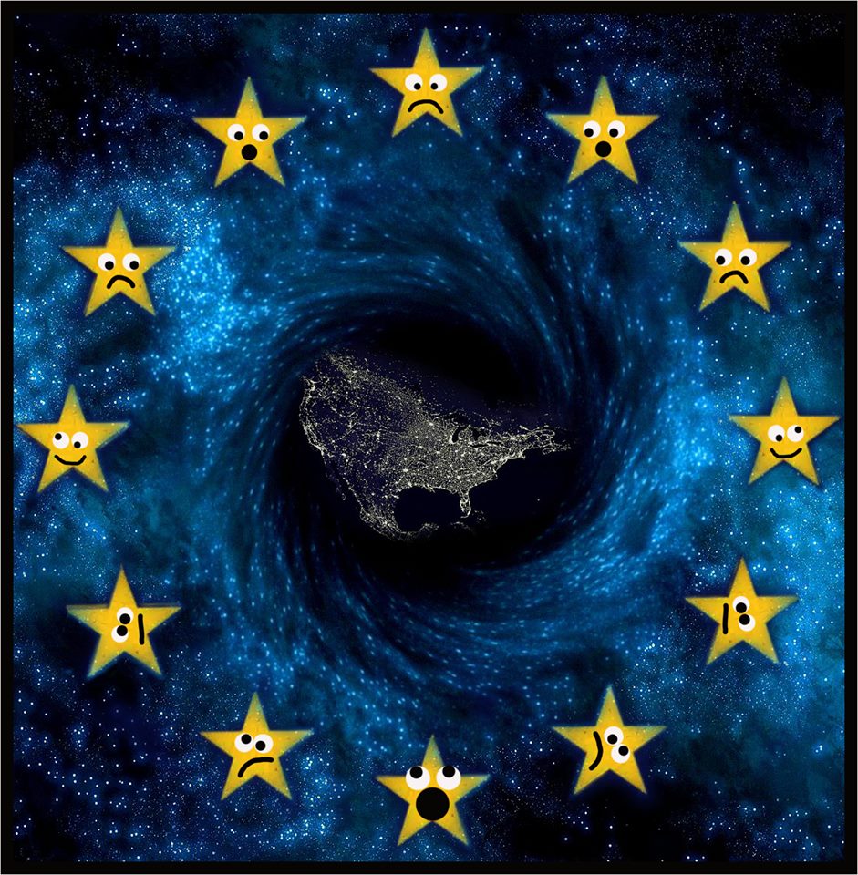 E há a União Europeia, com aquela bandeira que mostra uma constelação de estrelas as quais, não naturalmente, mas obviamente, orbitam em torno de algo – e algo que, porque é invisível, só pode ser um buraco negro.